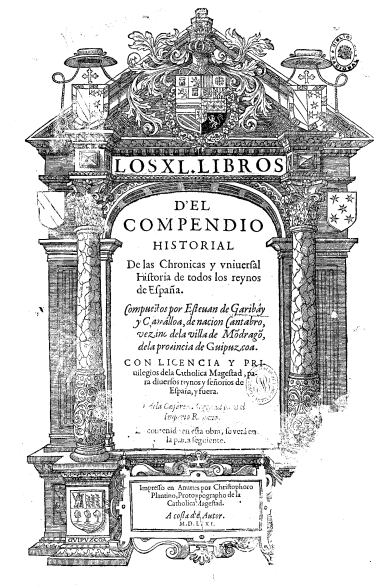 Lekuko gisa hemen Garibain bere Historia liburuan idatzi zuen orrialdea. Lehen edizioan, 1571, Amberes, IIII Liburua, IIII Kap, 91 orrialdean eta, bigarrenean, 1628, IIII Liburua, IIII Kap, 72 orrialdean ikusi daiteken moduan. Hemen lehen edizioren orrialdea.