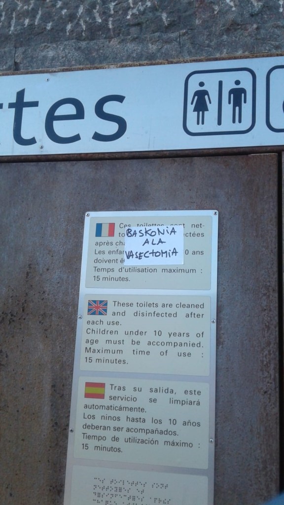 “Baskonia ala Vasectomia” idatzi du norbaitek euskara aldarrikatzen, euskararik agertzen ez den Mauleko gazteluko bidean dauden toiletteetan.
