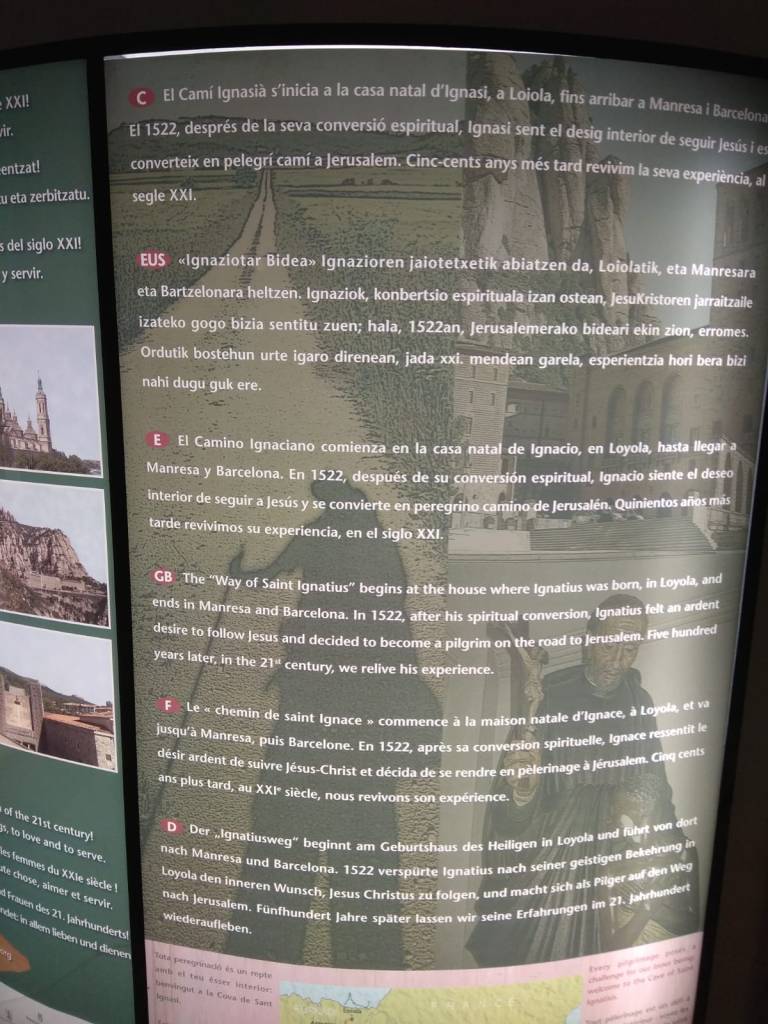 “Irudi batek mila hitzek baino gehiago balio du” dio esaera ezagunak eta sarritan horrela izaten da, oraingo fotografiak hizkietara eramango gaituen arren. Lagun baten bitartez etorri zait alboko irudia. Izugarrizko ilusioa egin dio euskara ikustea beste hizkuntzen artean, Kataluinako Manresan dagoen Cova de Sant Ignasi-ko informazio azalpenetan. Ni ere poztu naiz, zela ez!