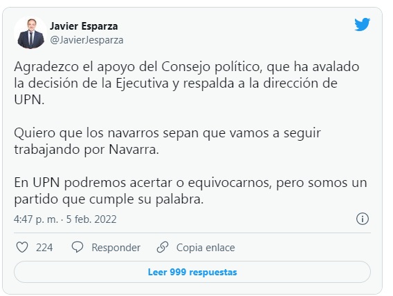 Esta desavenencia ha provocado, como no podía ser de otra forma, fuertes tensiones entre la dirección del partido y los dos representantes en el Congreso. En este clima de confrontación su presidente, Javier Esparza, ha realizado una serie de declaraciones y, entre ellas, ha apelado de forma reiterativa al valor de la palabra dada.