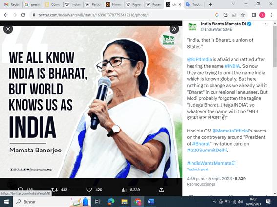 Mamata Banerjee publica un X que dice “todos sabemos que la India es Bharat, pero el mundo nos conoce como India” y acusa al partido gobernante “@BJP4India tiene miedo y se pone nervioso después de escuchar el nombre #INDIA. Por eso ahora están intentando omitir el nombre India, que es conocido mundialmente. Pero aquí no hay nada que cambiar, ya que lo llamamos Bharat en nuestros idiomas regionales. Pero Modi probablemente olvidó el eslogan «Judega Bharat, Jitega INDIA» (Bharat se unirá, India ganará), así que cualquiera que sea el nombre será «भारत हमको जान से प्यारा» (queremos a Bharat/India)”.