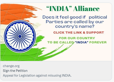 El pasado mes de agosto la oposición ha presentado una moción de censura en la Cámara Baja que no ha prosperado. Apuntan también a que persiste un malestar debido a la ola de violencia étnica, especialmente en Manipur y, acusa al gobierno de fomentar divisiones étnico-religiosas con fines electorales, apelando a la mayoría hindú que conforma la población, en la que el cambio de nombre profundizaría. Recuerda al gobierno que el Artículo 1 de la Constitución dice «La India, es decir Bharat, será una Unión de Estados” y que esta pluralidad que se plantea desde el primer artículo mismo se vería mermada con el cambio de nombre.
