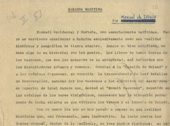 Allá por 1953, el gran Manuel de Irujo ya escribió un documento sobre la Nabarra Marítima, según ha hecho saber con muy buen tino Josean Beloqui en la red X, en el que relata la fundación de San Sebastián por el rey nabarro Sancho VI El Sabio y de que los barcos con pabellón nabarro operaban en el puerto de Bayona.