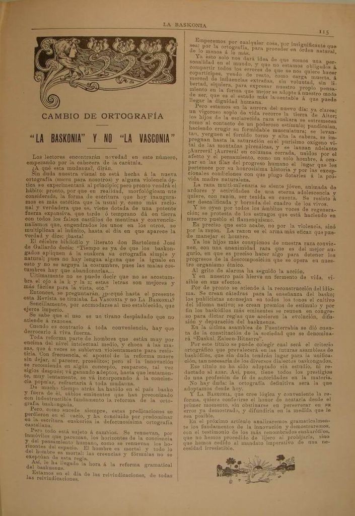 El texto en cuestión se titula Cambio de ortografía. “La Baskonia” y no “La Vasconia”, y en él el articulista expone las razones del cambio invocando a Bartolomé José de Gallardo, quien se expresaba así: