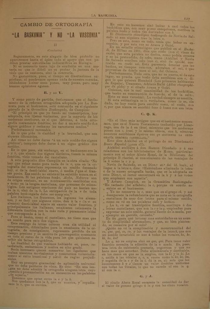 Esta actualizada forma de escribir adaptada a los nuevos tiempos se trasladó a todos los textos de la publicación hasta su cancelación en 1943, y fue adoptada también en otros libros y documentos editados en ese entorno. Si bien el nombre del país se escribía como Baskonia, la lengua y el gentilicio eran baska y basko, respectivamente.