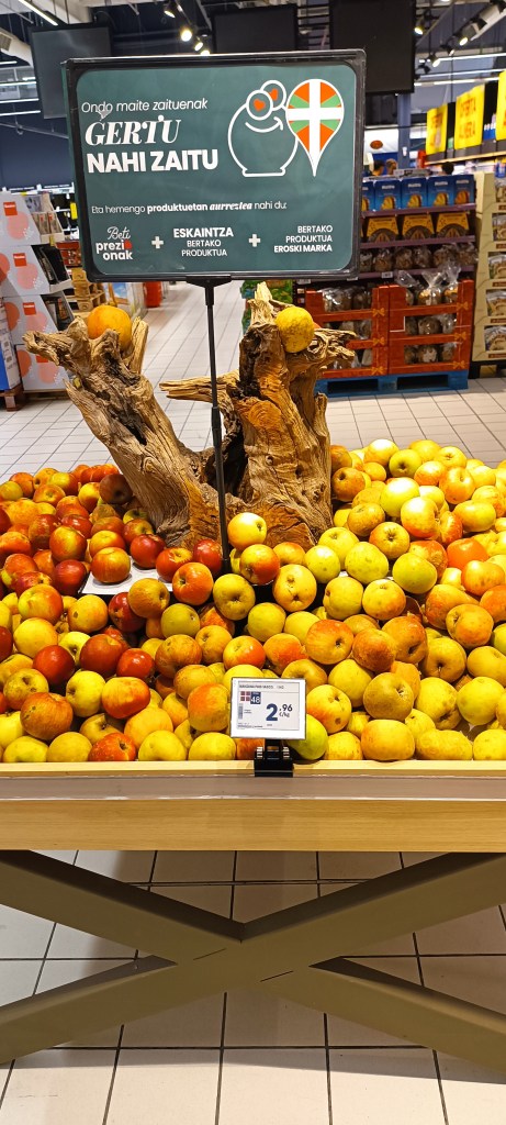 Etiketak honela zioen: “Manzanas País Vasco”, eta Origen: España, erdaraz soilik. Hau da gaur egungo gure lurraldetasuna identifikatzeko errealitatea: Baskonian ekoitzitako produktuak, Espainiako jatorritzat aurkezten direnak.