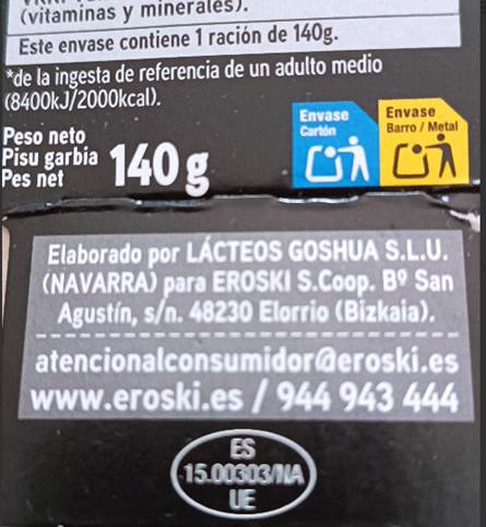 Lehen irudian, Origen de la leche: España jartzen du; bigarrenean, berriz, Lácteos Goshua S.L.U. (Navarra) para Eroski S. Coop., Bº San Agustín s/n, Elorrio (Bizkaia).